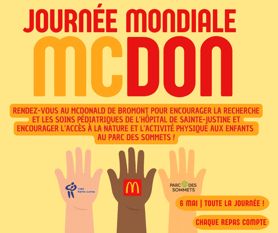 The funds raised will be shared between the Ronald McDonald House Charities, which supports families of sick children and contributes to pediatric research and care, notably at Sainte-Justine Hospital, and Parc des Sommets.