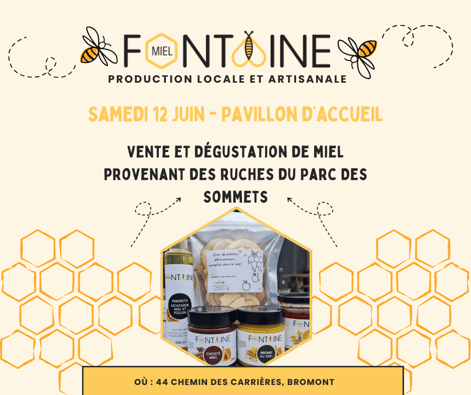 Une vente et dégustation de miel est organisé samedi le 12 juillet prochain, en collaboration avec Miel Fontaine, au pavillon d’accueil. Venez découvrir les produits de cette entreprise locale!